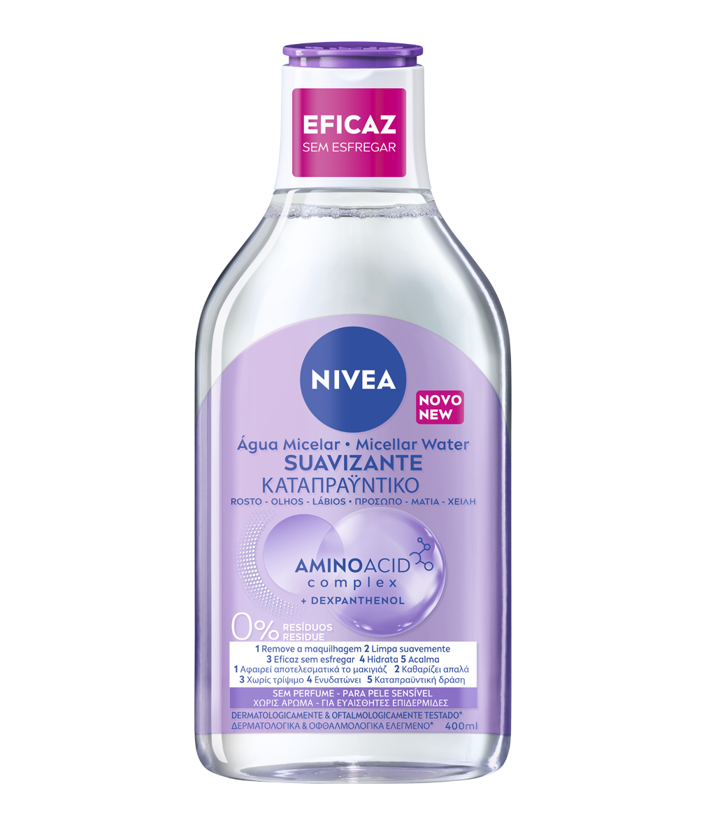 - Para pele sensível: a Água Micelar Suavizante foi formulada para remover eficazmente a maquilhagem e as impurezas da pele, sem necessidade de fricção. A fórmula, enriquecida com Complexo de Aminoácidos + Dexpantenol e sem perfume, promove uma sensação de calma após o uso. Disponível também em formato mini (100ml). PVPRNV: 6,89€