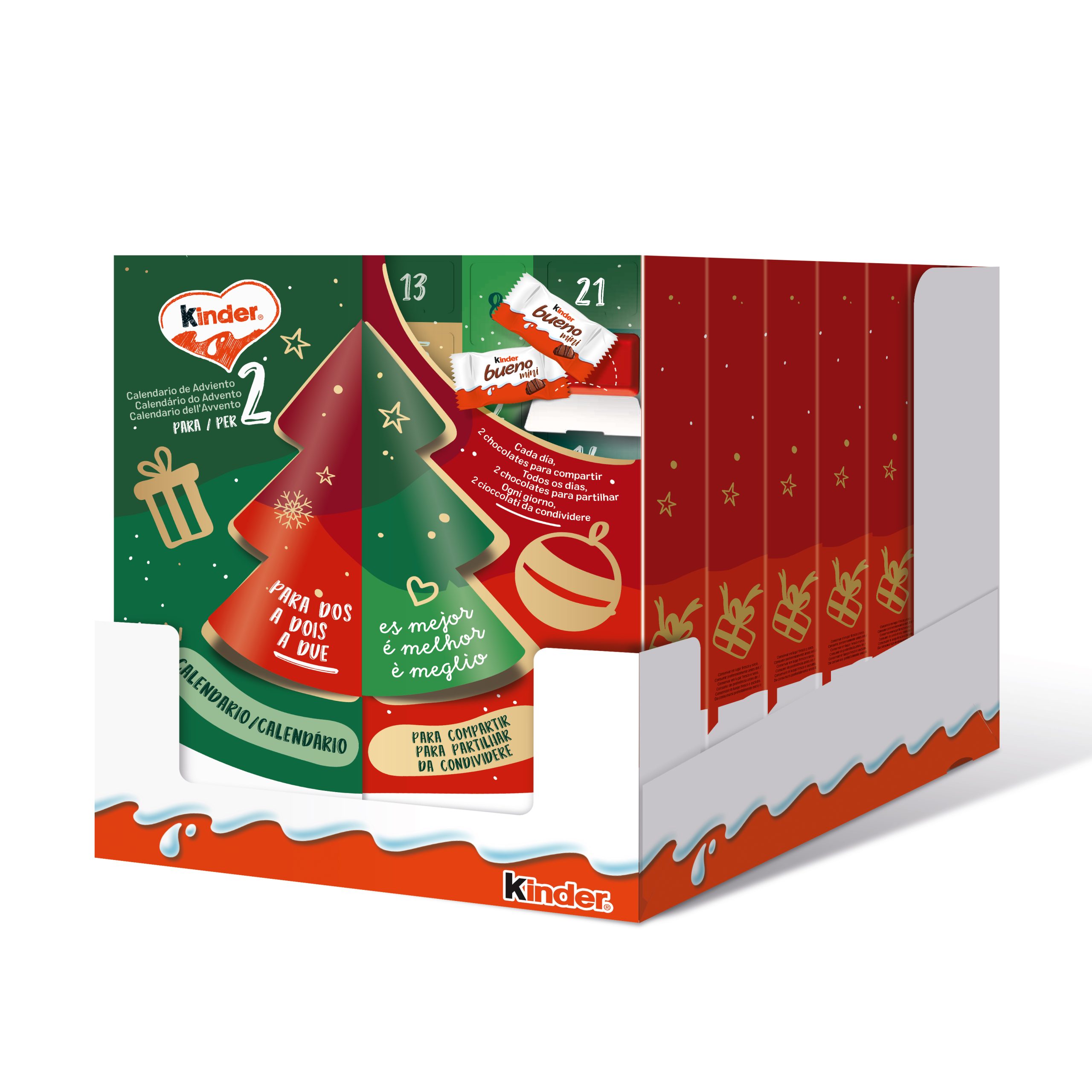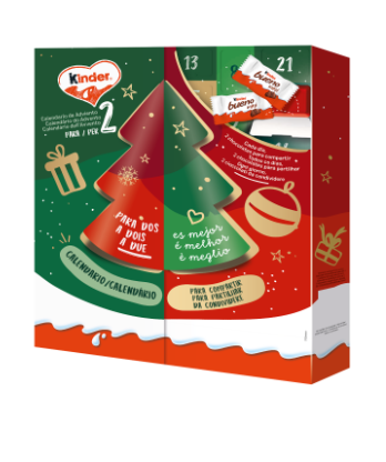 O calendário do advento perfeito para, com os deliciosos chocolates Kinder, viver em conjunto a contagem decrescente de forma mais doce. Partilhe a chegada do Natal com 24 janelas que escondem 48 peças (duas por dia), cheias dos inconfundíveis sabores Kinder.