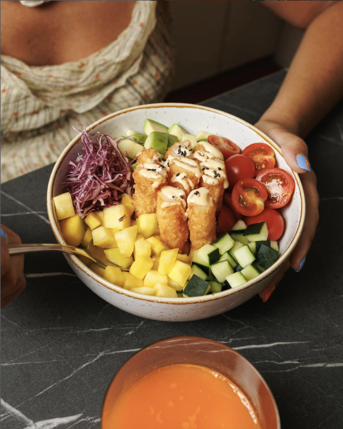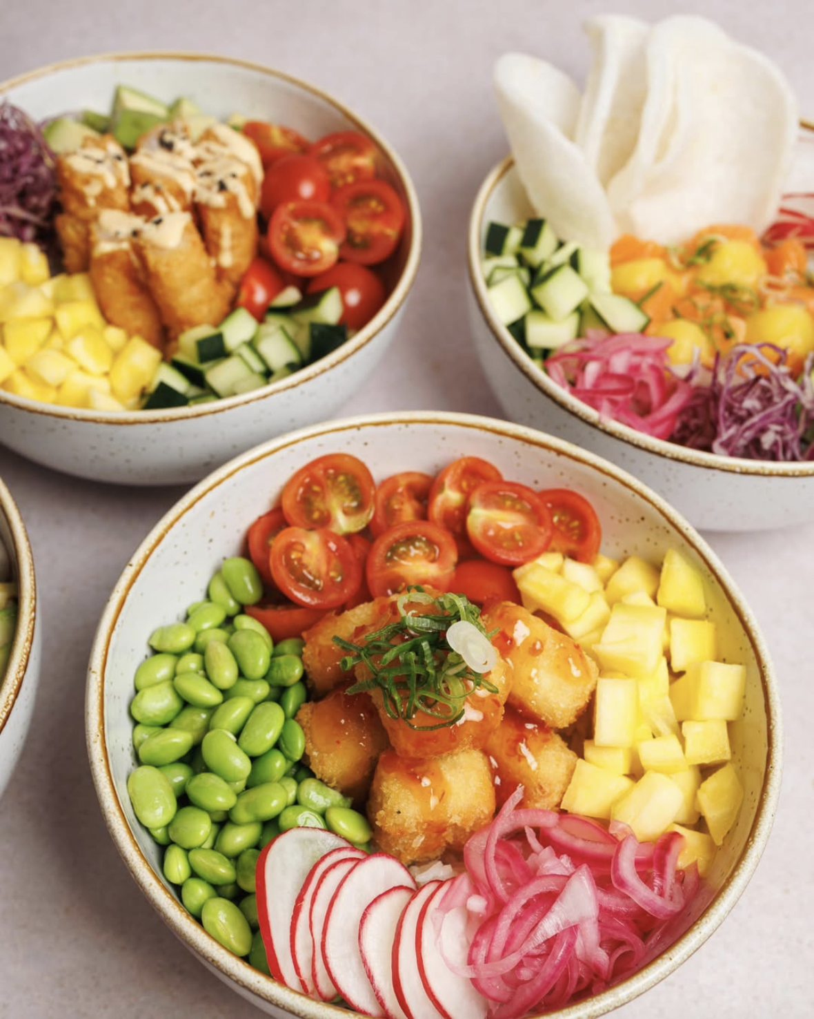O Popcorn Tofu (12,50€) é uma alternativa 100% veggie, mas não menos crocante: tofu panado e sweet chilli, edamame, tomate cherry, manga, rabanete e pickle de cebola roxa, sobre arroz de sushi e molho poke. Um mix de texturas e sabores que conquista qualquer um.