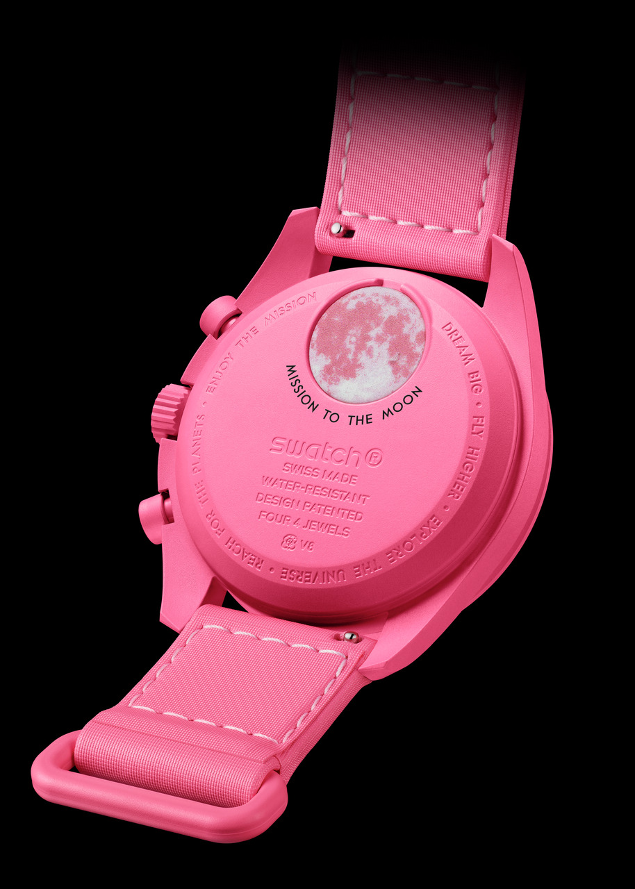 Tal como os restantes modelos da coleção Bioceramic MoonSwatch, este relógio é fabricado em Bioceramic — uma combinação de dois terços de cerâmica e um terço de materiais de origem biológica derivados do óleo de rícino. Mantém elementos clássicos do Speedmaster Moonwatch da OMEGA, como a caixa assimétrica e os submostradores embutidos.Os logótipos OMEGA X SWATCH estão presentes no mostrador e na coroa. No verso da caixa rosa, encontra-se gravada a declaração de missão. A tampa da pilha exibe uma lua em vários tons de rosa, enquanto a bracelete em VELCRO®️, também rosa, foi pensada para ser compatível com um fato espacial — um detalhe com inspiração espacial discreta, mas marcante.